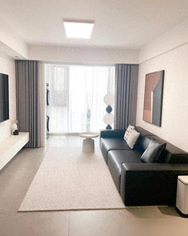 再看客厅,沙发、地毯、电视柜,就这三样,没有多余的边几、没有挂得密密麻麻的装饰画。